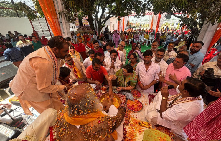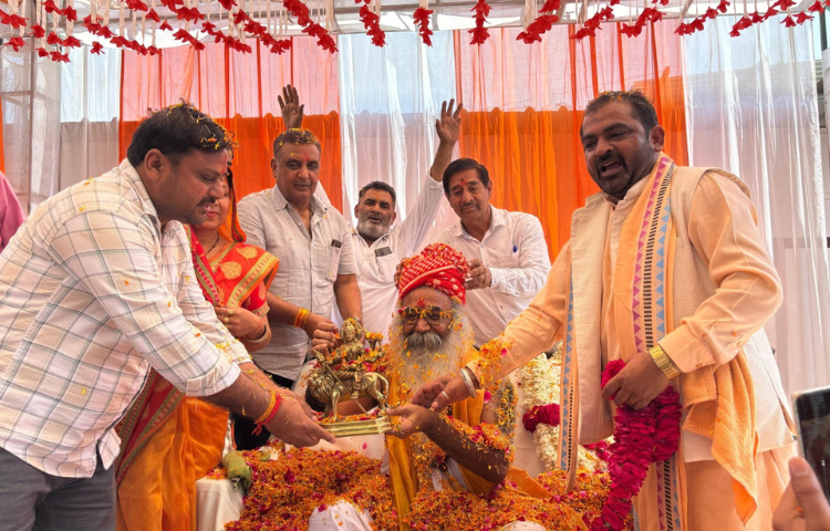 नौ दिवसीय मौन साधना पूर्ण होने के उपरांत श्री कल्कि पीठाधीश्वर आचार्य प्रमोद कृष्णम जी महाराज की चरण पूजा, पुष्प वर्षा कर पूजा- अर्चन करते हुए श्री कल्कि भक्त।