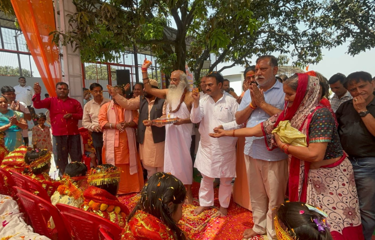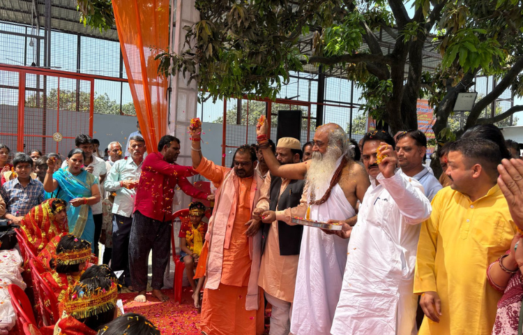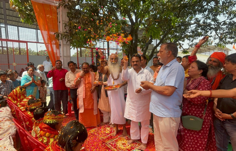 श्री कल्कि धाम में भगवती स्वरूपा कन्याओं पर पुष्प वर्षा करते हुए श्री कल्कि पीठाधीश्वर आचार्य प्रमोद कृष्णम जी महाराज।