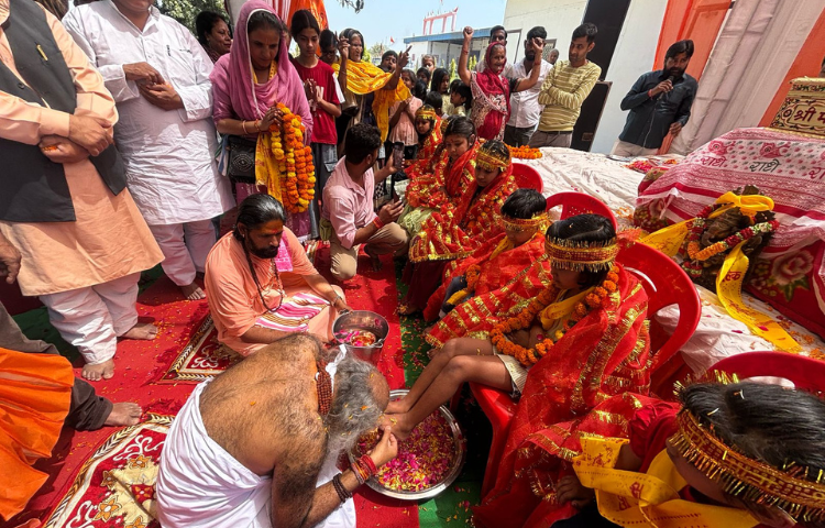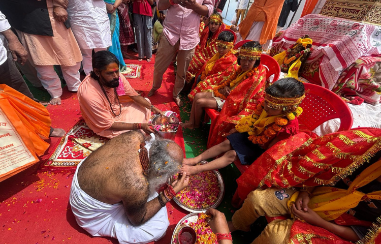 श्री कल्कि धाम में भगवती स्वरूपा कन्याओं के चरण वंदन करते हुए श्री कल्कि पीठाधीश्वर आचार्य प्रमोद कृष्णम जी महाराज।