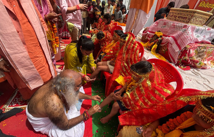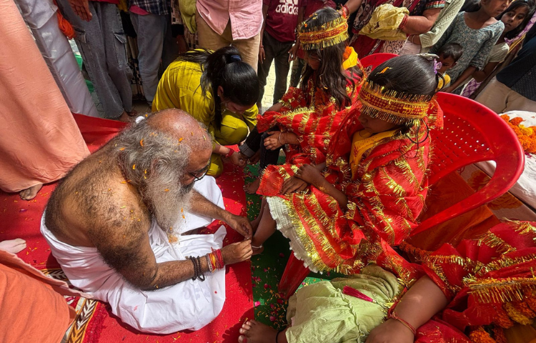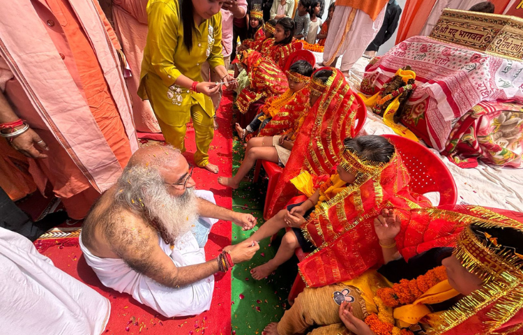 श्री कल्कि धाम में आदिशक्ति स्वरूपा कन्याओं को चाँदी के आभूषण भेंट करते हुए श्री कल्कि पीठाधीश्वर आचार्य प्रमोद कृष्णम जी महाराज।